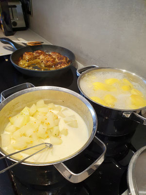 Kartoffeln schälen, waschen und in die gewünschte Größe schneiden. Kartoffeln in Salzwasser garen. Abgießen. Warmhalten.