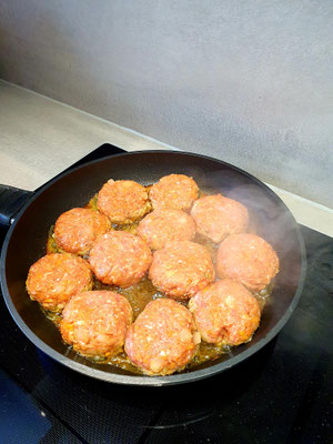 Die leckere Fleischmasse wird dann schön zwischen den Handflächen rollend zu Friko´s in Wunschgröße geformt. Damit sich die Frikadelle beim Braten nicht zu stark wölbt drückt Ihr mit dem Daumen