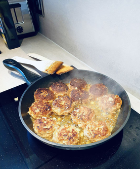 Zum Garpunkt ist zu sagen, dass unsere idealtypische Frikadelle in dem Moment aus der Pfanne raus muss, wenn der Kern so gerade nicht mehr roh ist. Genau an dem Punkt ist sie gar und maximal