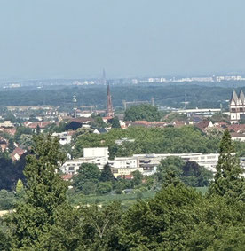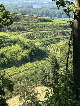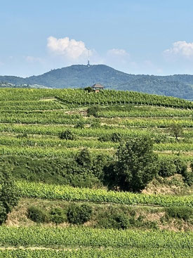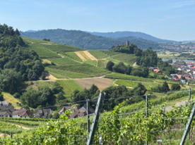 Weiter geht es bergauf, und mit jedem Schritt öffnet sich der Blick weiter: vor uns breiten sich die sanft abfallenden Weinberge aus, dahinter die Rheinebene, Offenburg liegt uns zu Füßen – und in der Ferne ist sogar der Turm des Straßburger Münsters vor der Kulisse der Vogesen zu erkennen.