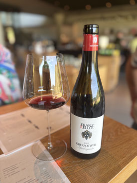 Am Donnerstagmorgen fahren wir nach Freiburg. Wegen des Feiertags hat das Restaurant "Kuro Mori" für das Mittagessen leider geschlossen. So landen wir in der "Löwengrube" - sehr schön, insbesondere die Weinkarte. Wir beginnen die Reise mit einem 2022er Bernhard Huber Malterdinger Spätburgunder zum Essen. Rote Kirschen und Himbeeren werden erkannt. Ein wunderbarer Einstieg.